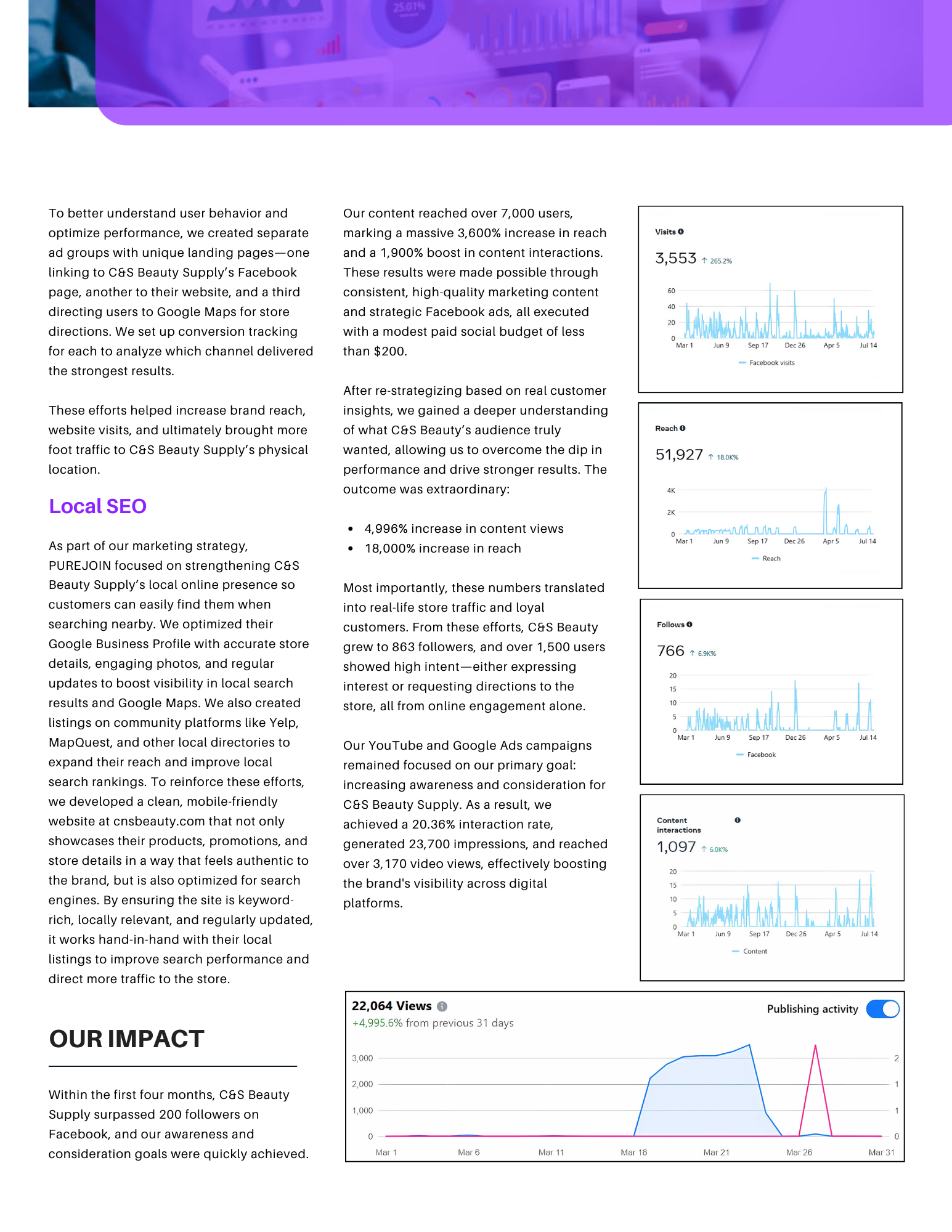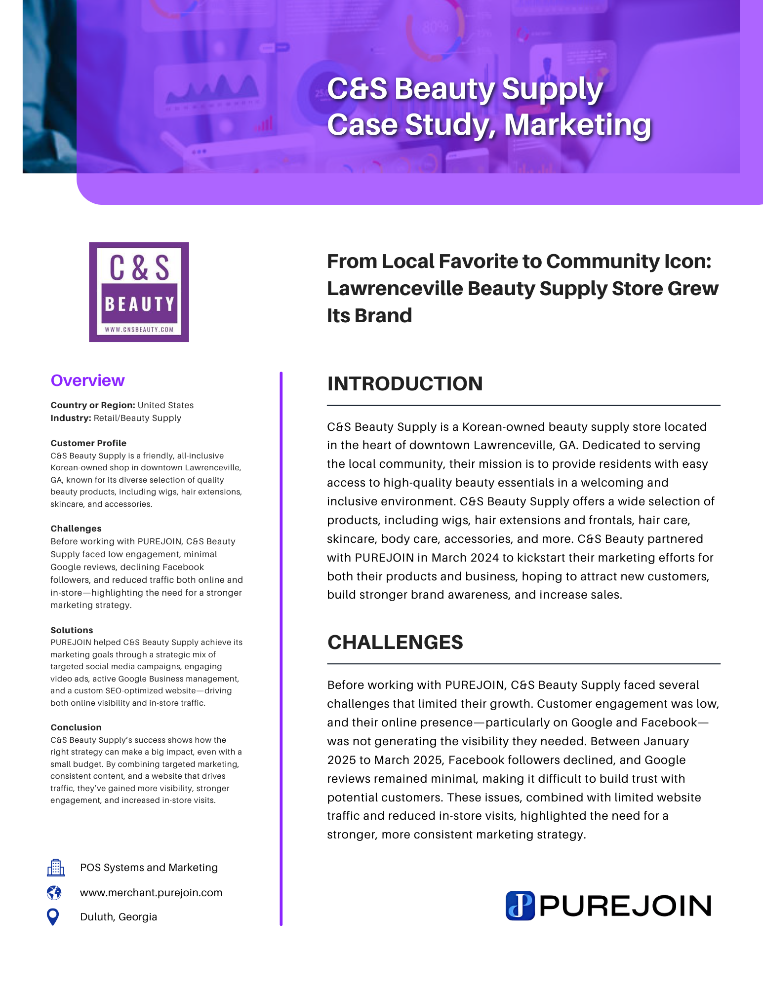 PUREJOIN helped C&S Beauty Supply achieve its marketing goals through a strategic mix of targeted social media campaigns, engaging video ads, active Google Business management, and a custom SEO-optimized website, driving both online visibility and in-store traffic.